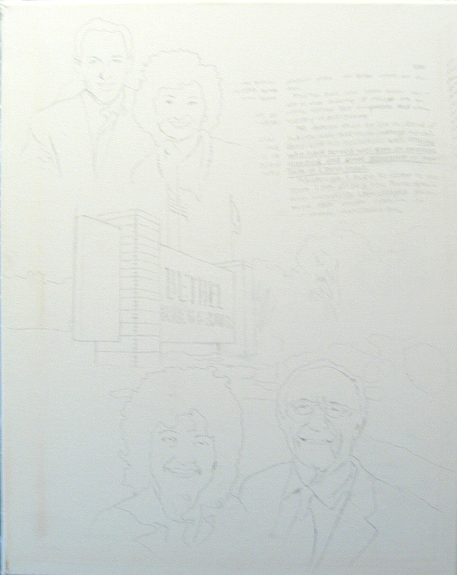 1. I start with a sketch to get the proportions down correctly. It's simply pencil on white canvas. Once the sketch is done, I seal it in with a clear acrylic medium, to prevent the pencil from being smeared while I'm painting.